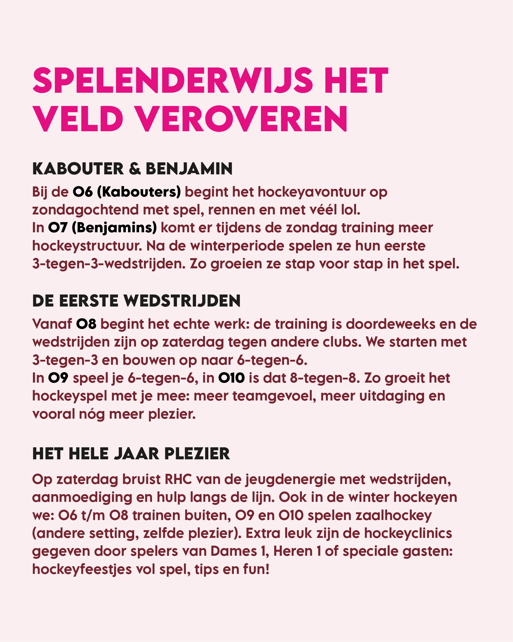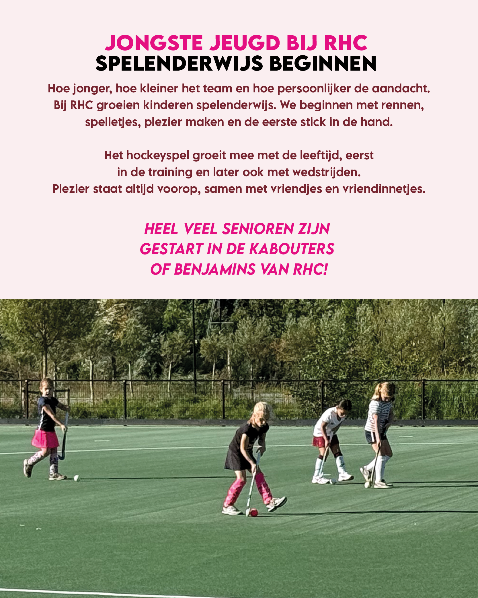 Op zaterdag bruist RHC van de jeugdenergie met wedstrijden, aanmoediging, hulp langs de lijn en bij Diensten. Ook in de winter hockeyen we: O6 t/m O8 trainen buiten, O9 en O10 spelen zaalhockey (andere setting, zelfde plezier). Extra leuk zijn de hockeyclinics gegeven door spelers van Dames 1, Heren 1 of speciale gasten: hockeyfeestjes vol spel, tips en fun.