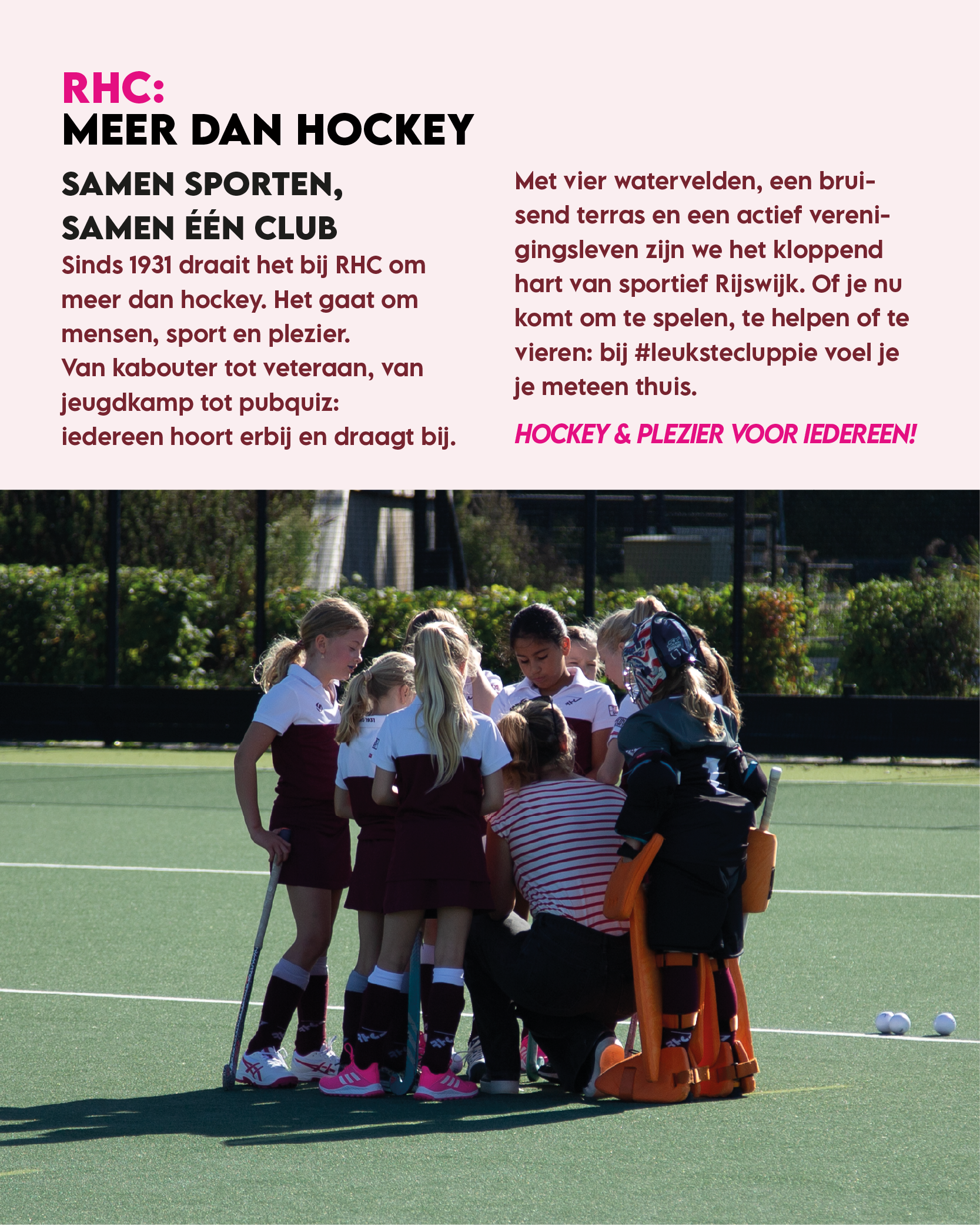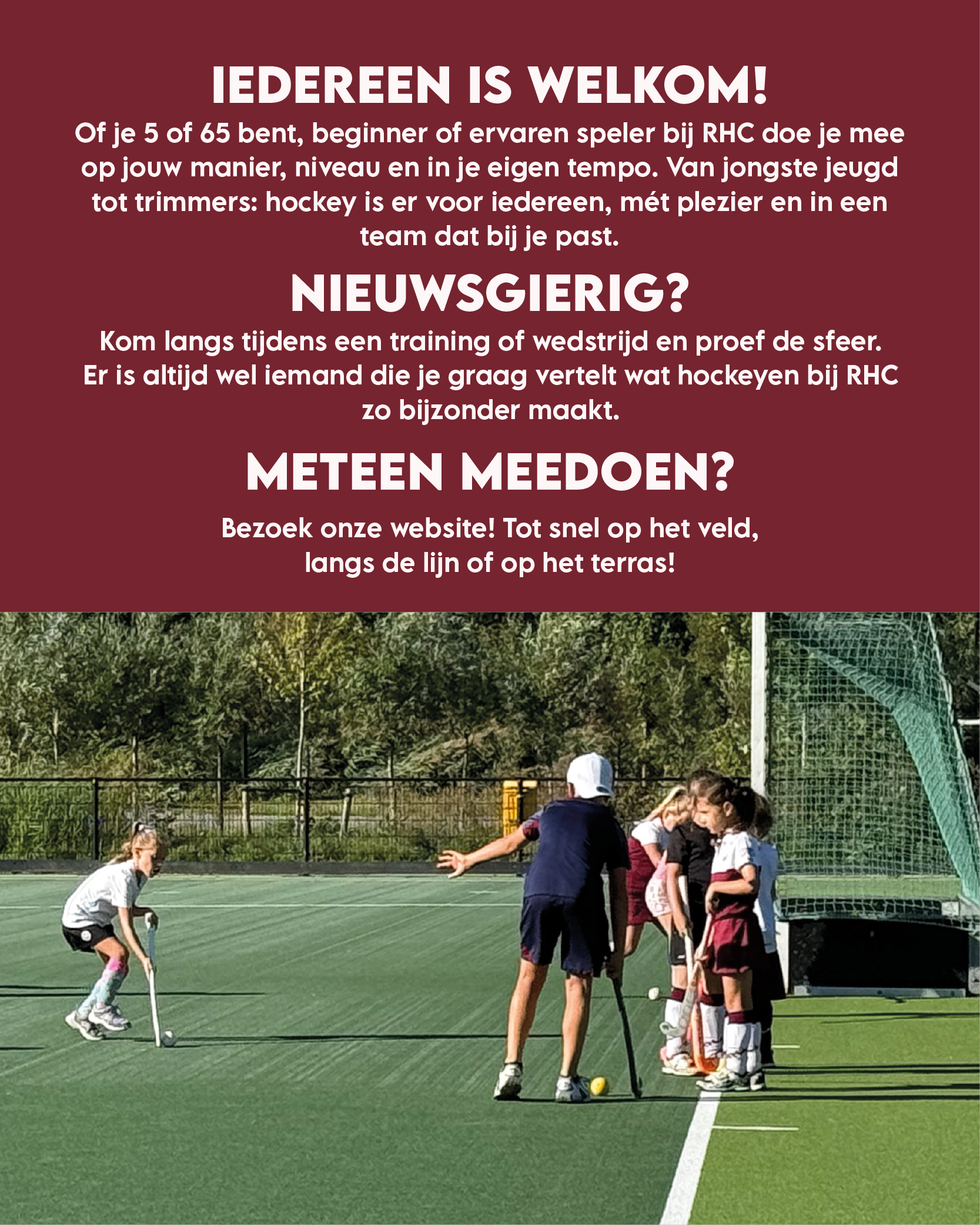 Je bent van harte welkom! Kom langs tijdens een training of wedstrijd en proef de sfeer. Er is altijd wel iemand die je graag vertelt wat hockeyen bij RHC zo bijzonder maakt.