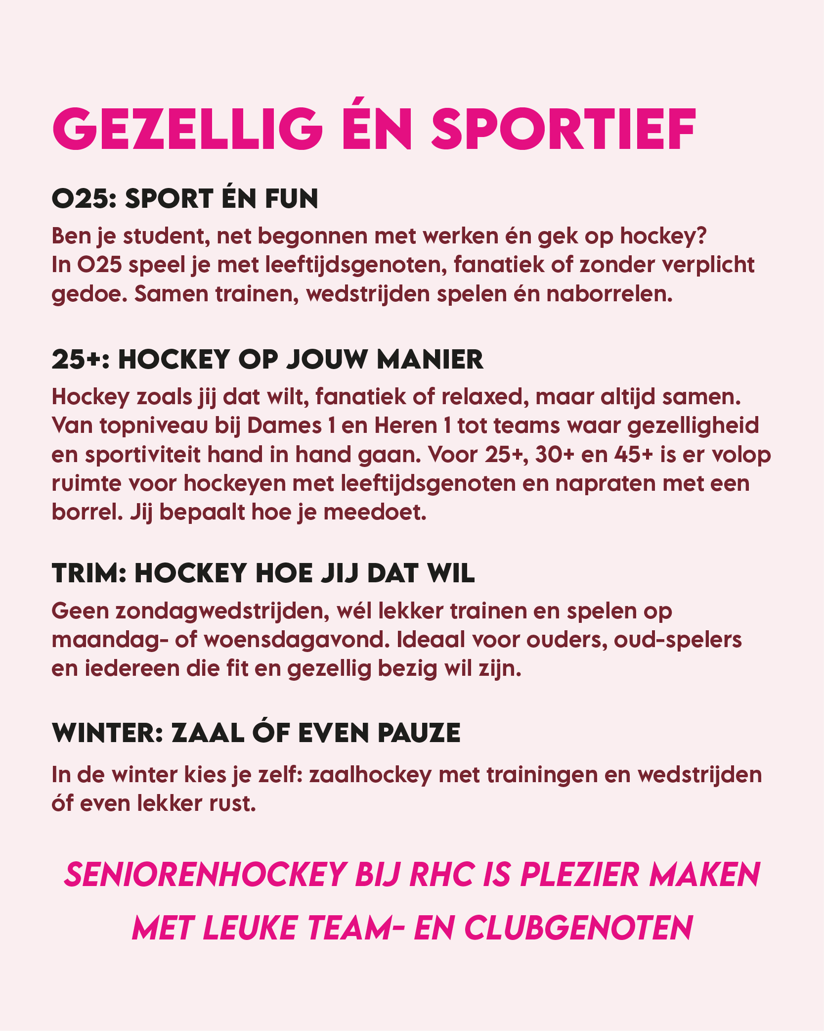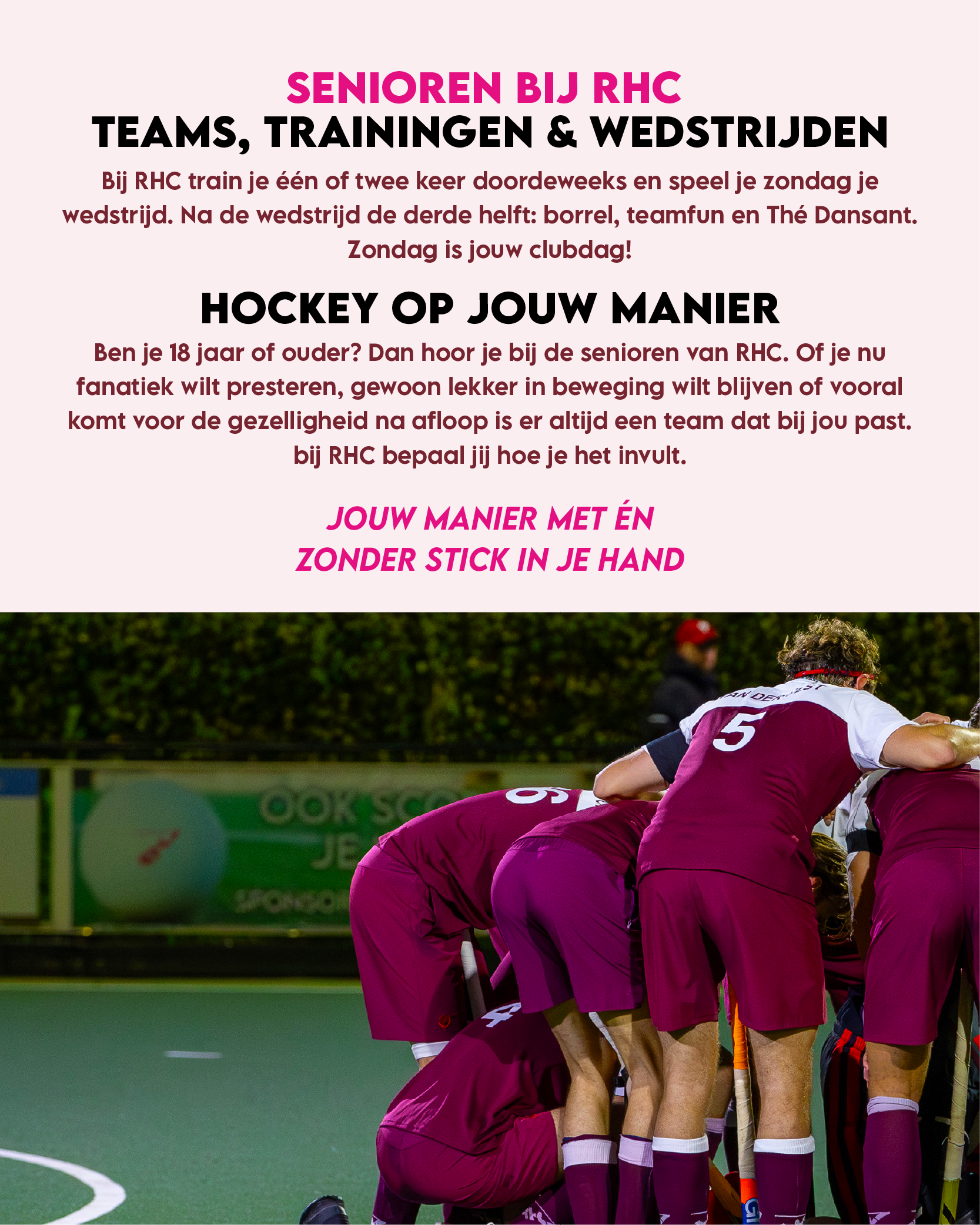 Fanatiek of relaxed, prestatie of gezelligheid, met of zonder stick in je hand ... bij RHC kan het allemaal. Ben je 18 jaar of ouder, dan hoor je bij de senioren en kies je zelf hoe je mee wilt doen. Wil je vol voor prestaties gaan, gewoon lekker in beweging blijven of vooral genieten van de derde helft? Er is altijd een team dat bij jou past. Bij RHC bepaal jij hoe je hockey beleeft.