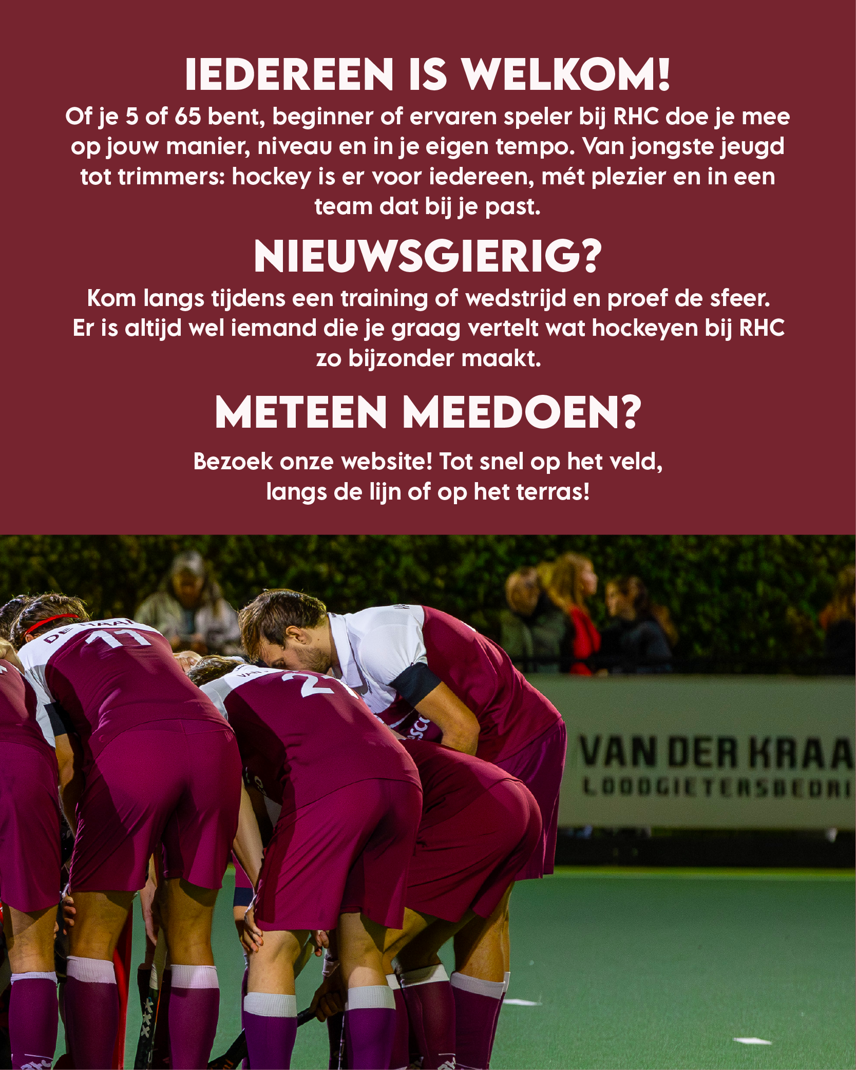 Je bent van harte welkom! Kom langs tijdens een training of wedstrijd en proef de sfeer. Er is altijd wel iemand die je graag vertelt wat hockeyen bij RHC zo bijzonder maakt.